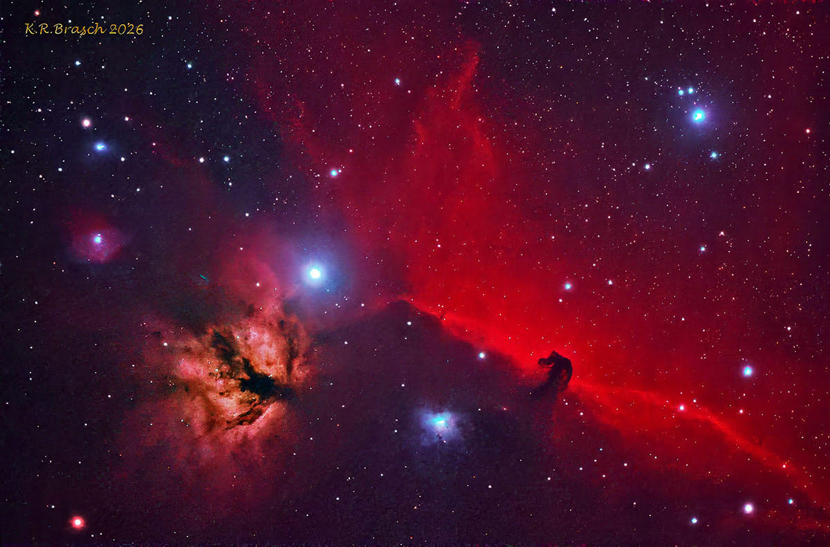 This iconic image of the Flame and Horsehead nebulae are part of the massive star forming regions in Orion, a universally recognized constellation in our northern winter skies. These nebulae form part of the mythical hunter’s belt and remind us once again how beautiful nature is and how small we and our pale blue planet are.